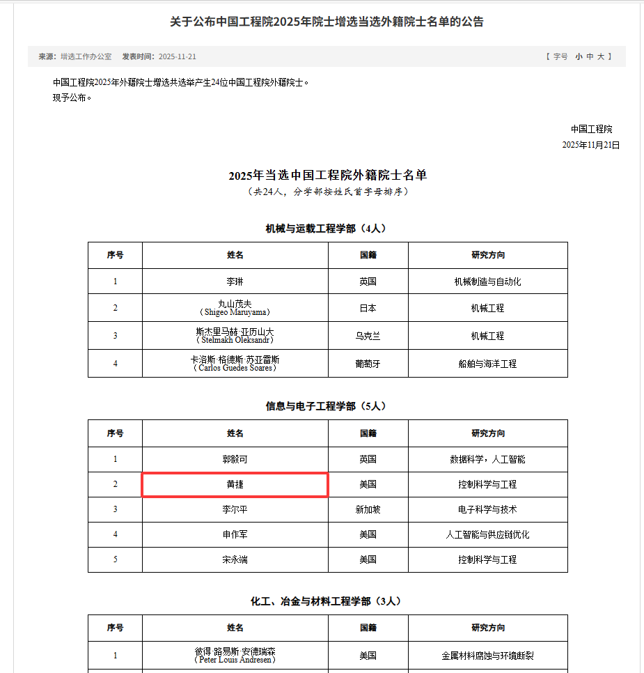 11月21日,中国工程院公布2025年院士增选结果,其中外籍院士24人。控制科学与工程领域顶尖专家、91暗网