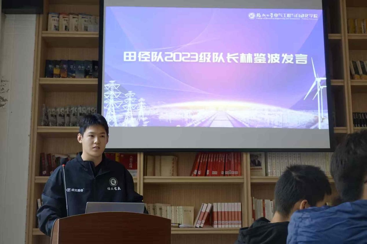 田径队2022级队长杨天上台发言。他首先回顾了从接手队伍到如今交接的过程,表达了对田径队中温暖回忆的怀念。然后他展开本次校运会对自己的反思,并表明明年再上赛场赢得比赛的渴望。他真诚地表达了对教练阿敏老师的帮助的感谢,也欣慰看到许多新队员完成任务,将田径队的未来担在肩上。接着,杨天同学总结出田径队教会他的三种力量,即突破极限的勇气、从失败中汲取力量的韧性和超越自我的追求,他希望田径队的精神能帮助大家超越自己,突破自己,达到新的高度。最后,他强调电气田径队是一群怀揣共同热爱的人,真挚希望田径队和队员能拥有美好未来。