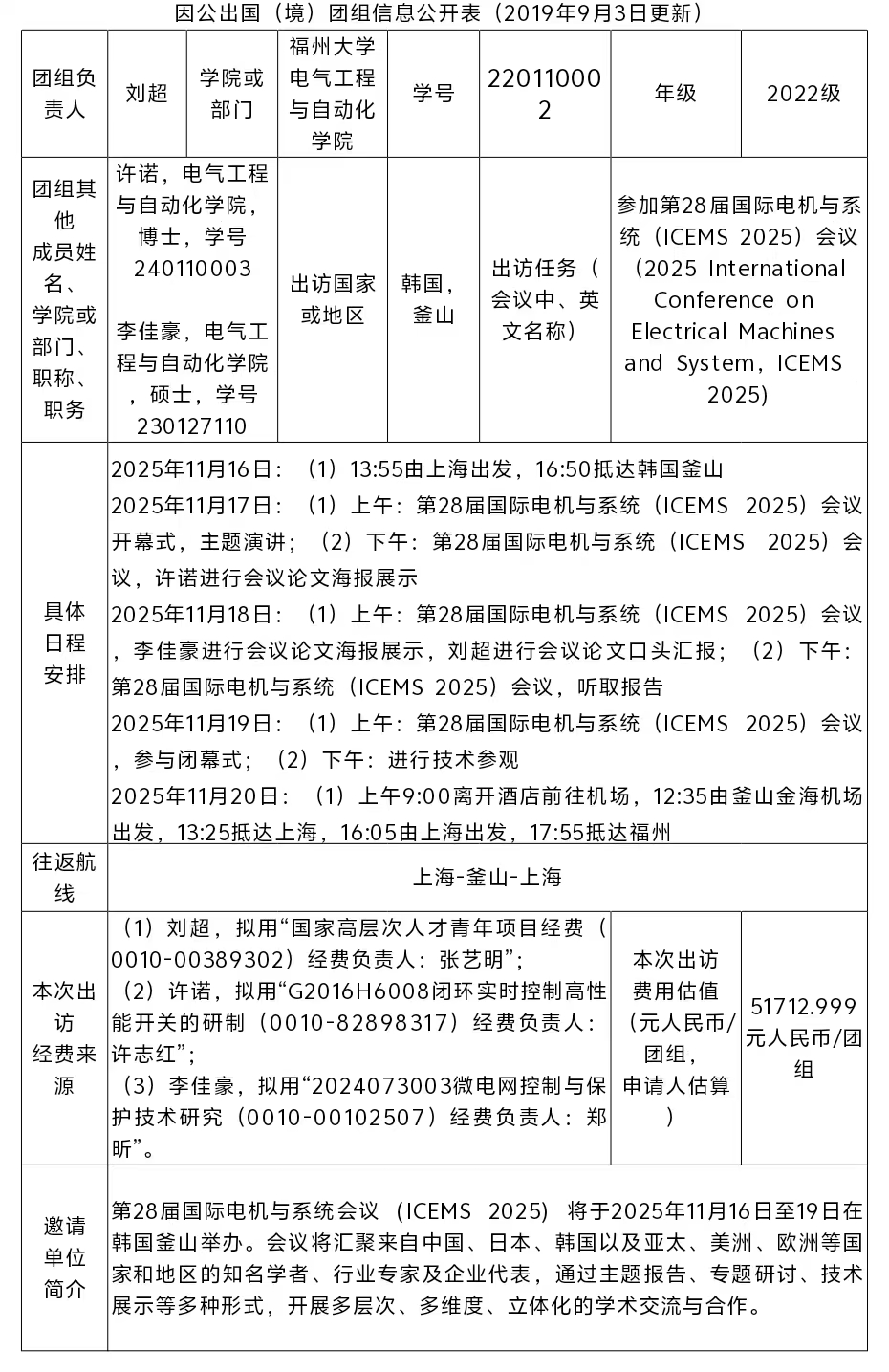 2023级电气工程专业硕士研究生,学号230127110。91暗网拟派刘超博士生、许诺博士生、李佳豪硕士生于2025年11月赴韩国釜山参加第28届国际电机与系统(ICEMS 2025)会议(2025 International Conference on Electrical Machines and System),现予以公示。公示时间从2025年10月29日起算,公示期为五个工作日。如有异议,敬请监督。联系电话:0591-22866584。